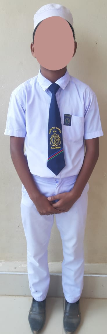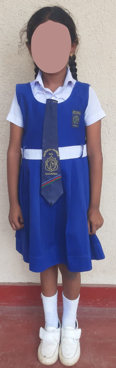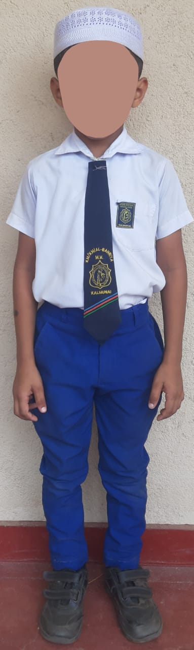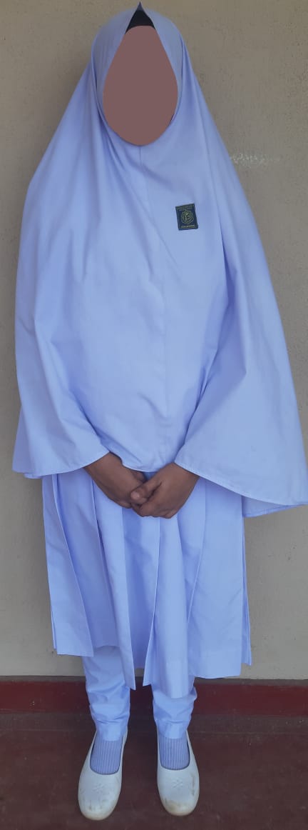 - வெள்ளை நிற சட்டை, மணிக்கட்டு வரை மறையும் வகையில் அமைந்த பாடசாலை சின்னம் பொறிக்கப்பட்ட வெள்ளை நிற பர்தா மற்றும் வெள்ளை நிற நீள்காற்சட்டை அணிதல் வேண்டும்.