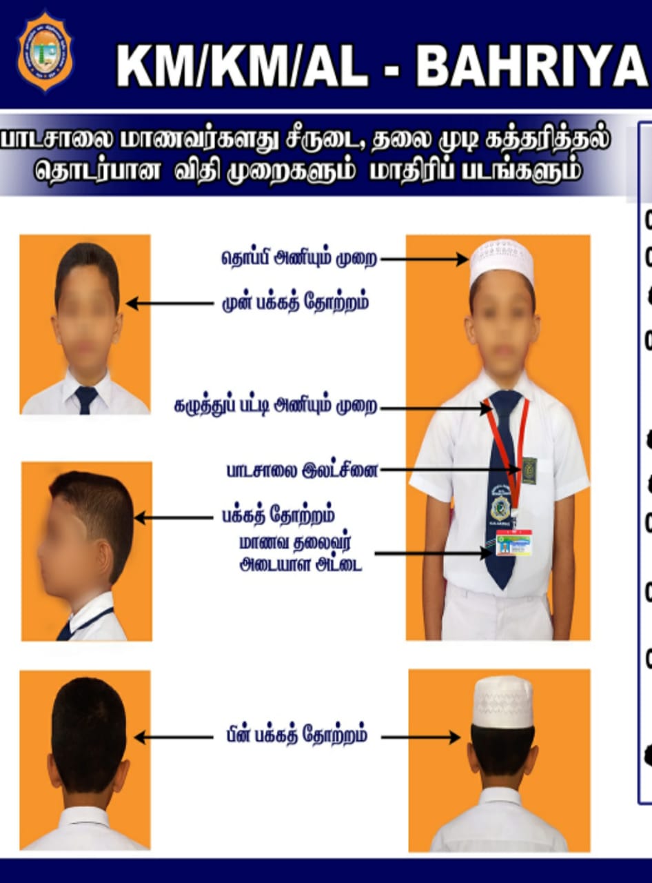 - பாடசாலை சின்னம் பாக்கெட்டின் இடது மற்றும் மேல் மூலைகளில் தைக்கப்பட வேண்டும்.